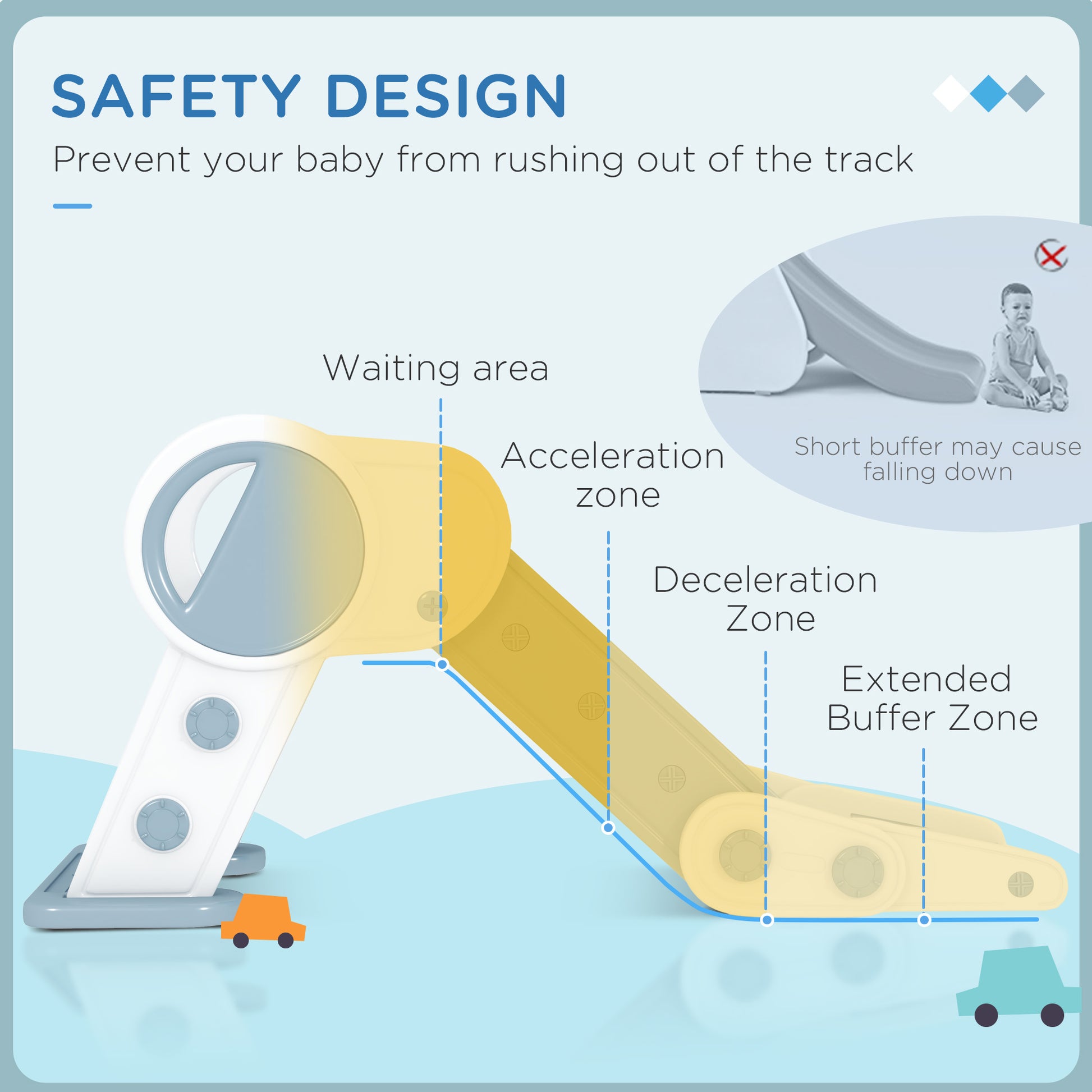 - Includes an acceleration zone, deceleration zone and buffer zone, allowing kids to slide smoothly and land safely