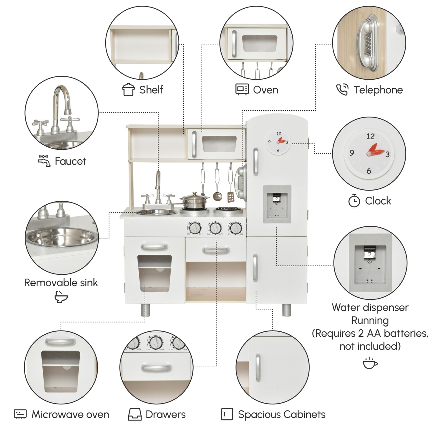 HOMCOM Kids Wooden Pretend Play Toy Kitchen Cooking Set Role Play Phone for Boys Girls White