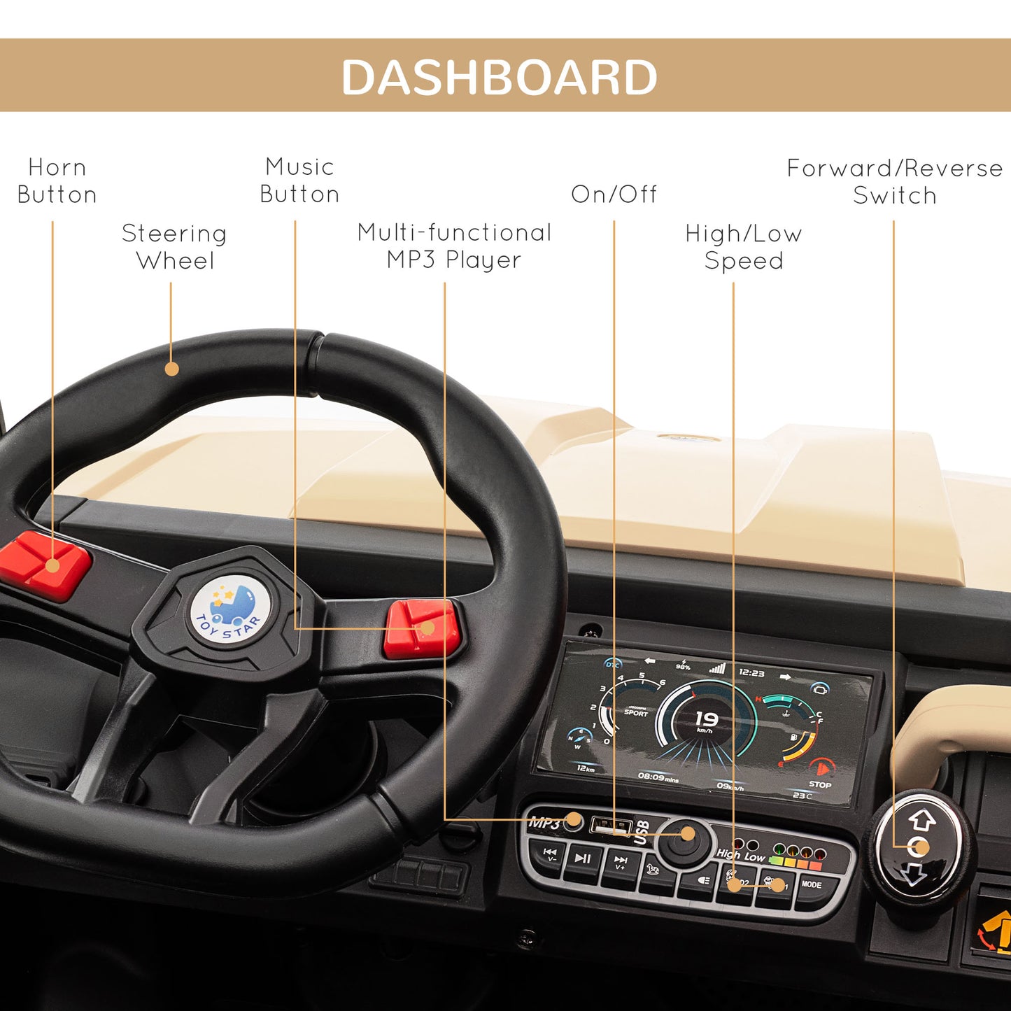 With this HOMCOM electric ride-on, kids will feel all the joys of driving. It's a two-seater, so they can bring friends along and enjoy the fun together. Capable of going up to 6km/h, this kids ride on utv features a music player, LED headlights and a horn β just like the real thing. The remote control lets parents get involved and control the electric UTV, so no people misses out on the enjoyment.