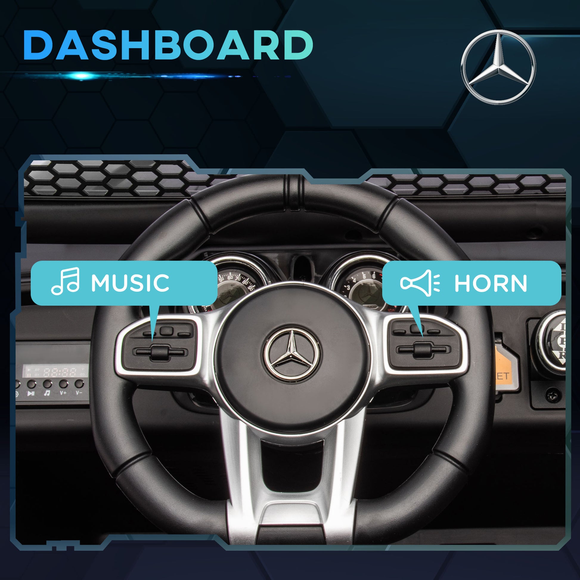Enjoyable memories to last a lifetime, thanks to this HOMCOM kids electric car. An official Mercedes-Benz design, its off-road style screams fun and adventure. It has LED lights, a viewing screen, four included songs and A USB slot, so you can enjoy your own music. They'll cruise at a safe speed between 3-5km/h, with the shock absorbers and large tyres ensuring the ride is smooth and stable. A simple way to fill their childhood with fun and excitement, making their early years unforgettable.