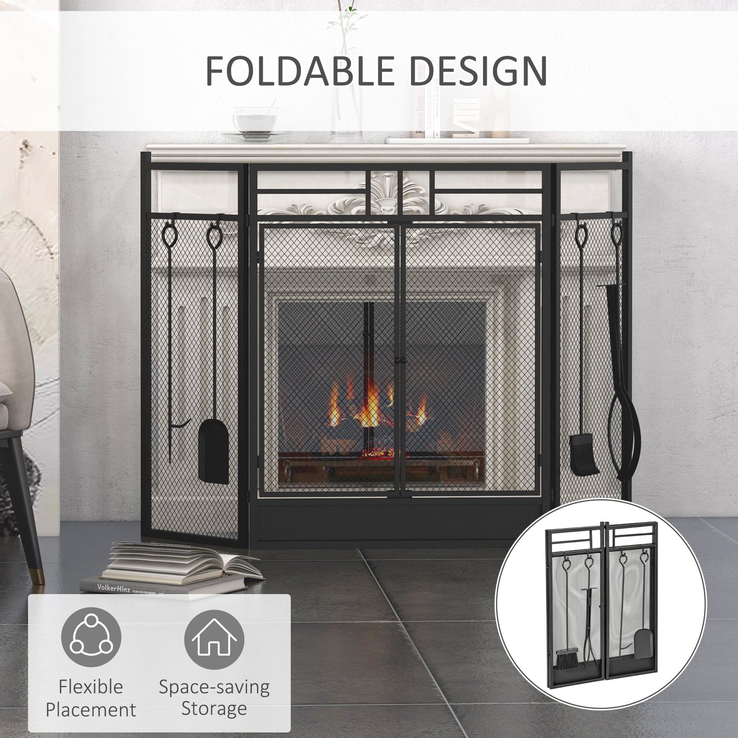 HOMCOM 3 Panel Folding Fireplace Screen with 4 Tools Set, Steel Mesh Spark Guard with Double Door for Open Fire, Log Burner, 122W x 80H cm, Black