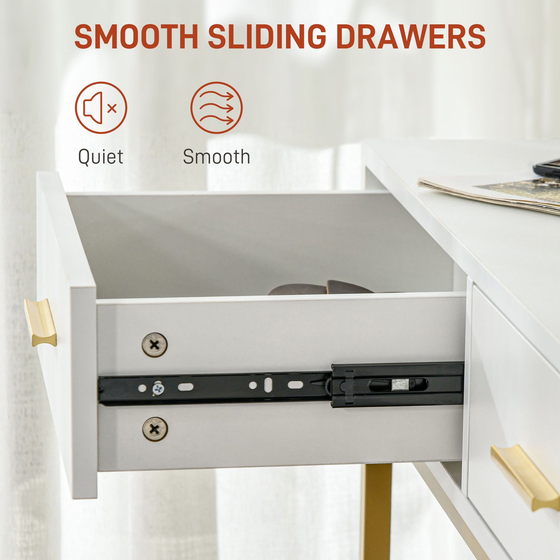 - Drawers slide quietly and smoothly