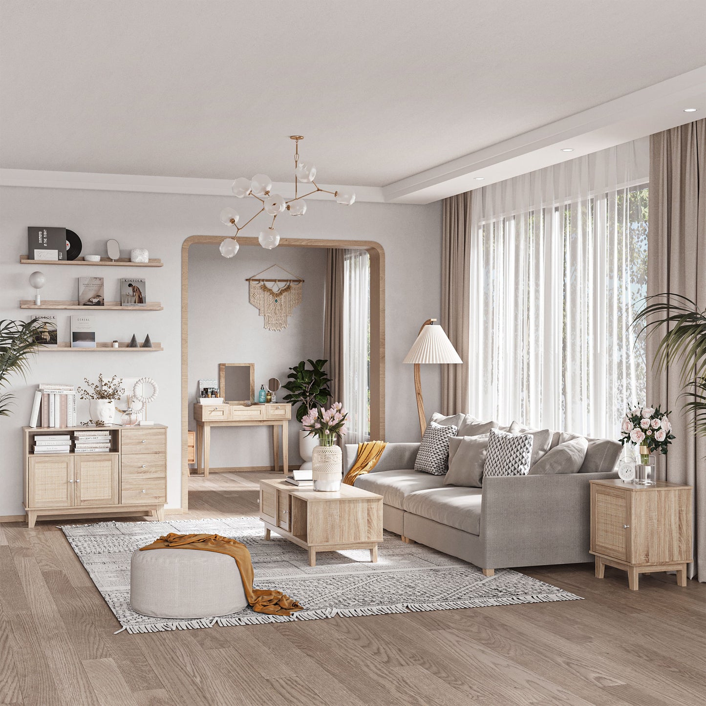 A natural look for a natural home look. This small HOMCOM table blends a wood-effect structure with a front rattan panel - bringing the beauty of nature inside this season. A small cubic design is great for fitting next to your bed or sofa; the structure made from particle board for durability. The inside middle shelf gives you two storage compartments; it is adjustable to different levels to suit you. Complete with polished metal handle.