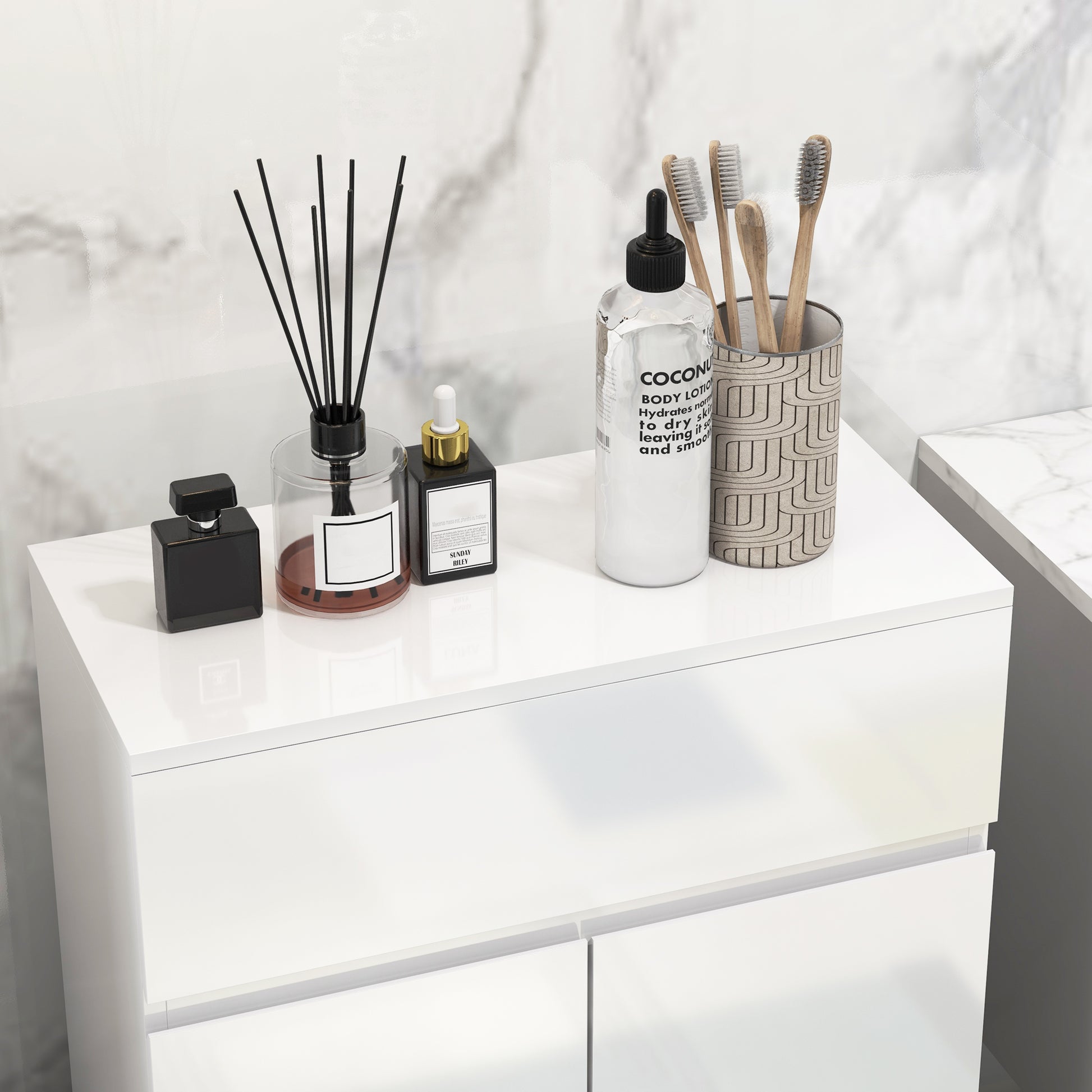 - Combines top drawer and bottom cupboard: room for bathroom essentials