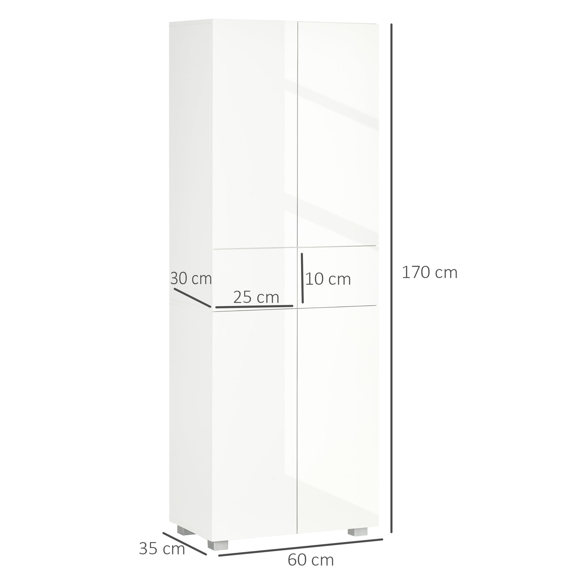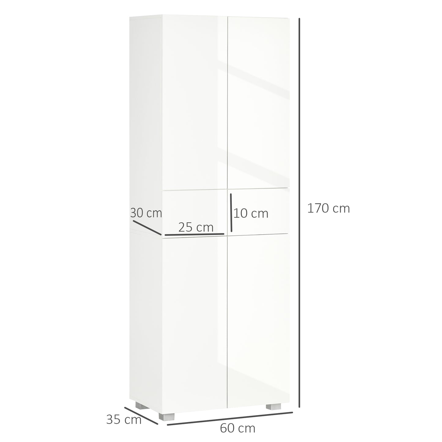 HOMCOM 4-Door Kitchen Cupboard, Freestanding 5-Tier Storage Cabinet with 3 Adjustable Shelves, 2 Drawers for Living Room, Dining Room, Push to Open Design, High Gloss White