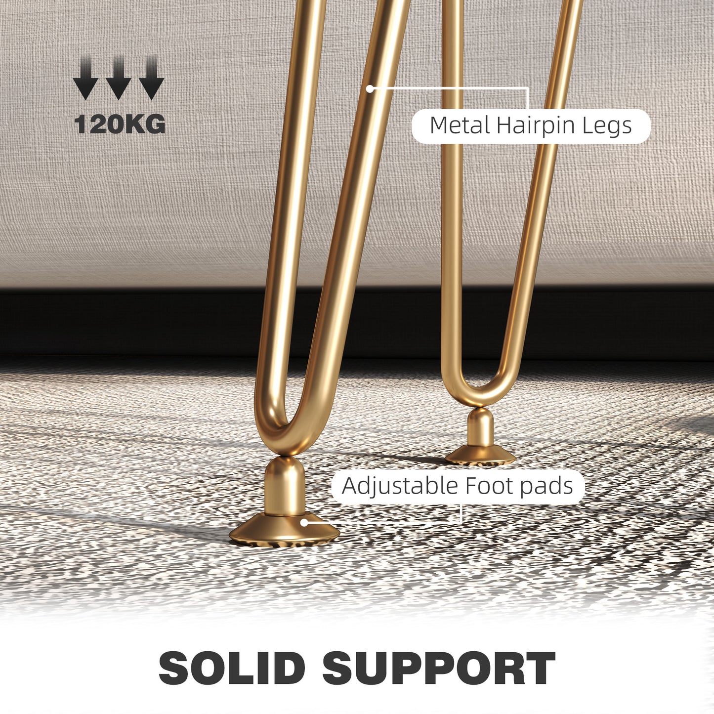 Luxurious functionality in the home with this HOMCOM ottoman. Inside it has a 5L storage space, making room for plenty of smaller items. Wrapped in velvet-feel upholstery this is a soft and beautiful piece which looks great wherever you stand it, complete with gold coloured metal hairpin legs for strong support.