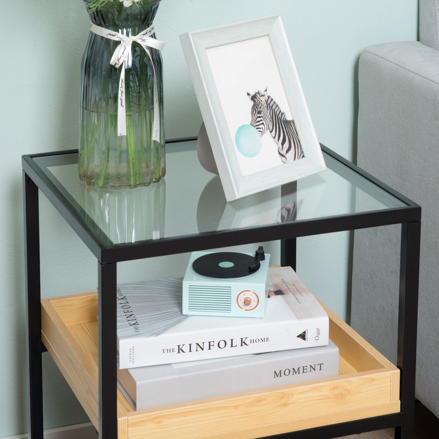 HOMCOM Glass Top Side Table, 3-Tier End Table with Storage Shelves, Nightstand with Steel Frame for Bedroom