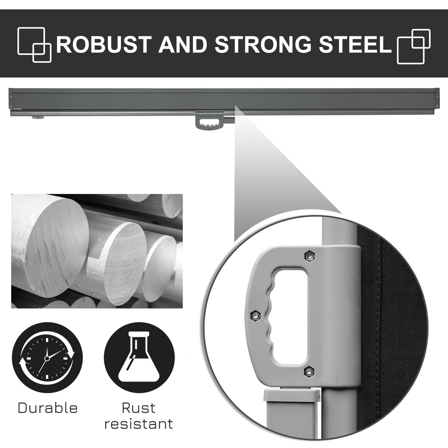 Prevent glaring sun and gusting winds disturbing you outdoors with this retractable screen from Outsunny. The metal base frame is tough to ensure it is a lasting addition in your garden, with it attaching securely and easily to cement or solid wood for quick set up. The free standing awning is made from polyester with PA coating for weather-resistance, with it pulling out smoothly and fixating in place with the clip lock handle β a simple operation. A great way to enjoyably extend your time out in the garden.