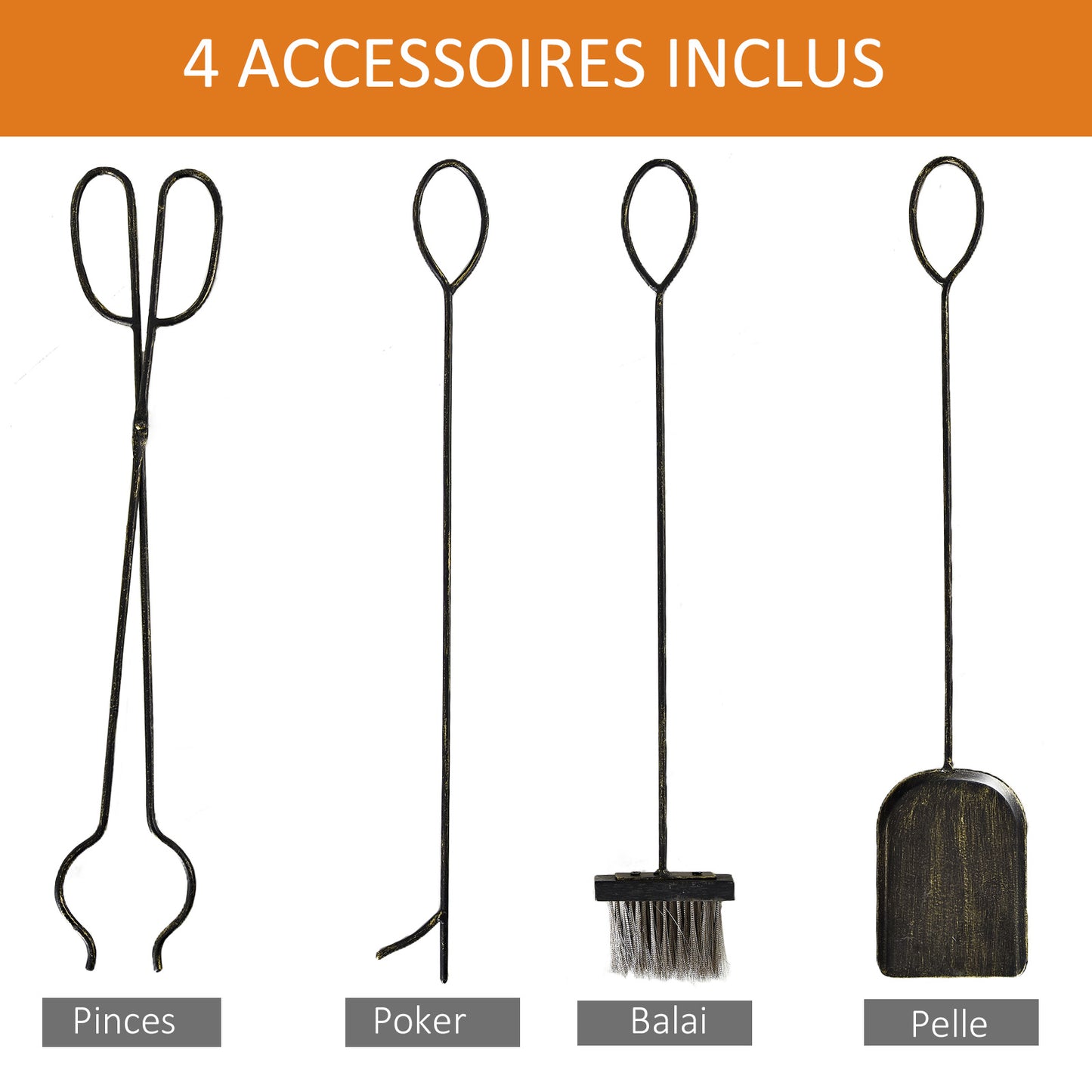 - 1 x firewood rack 1 x broom 1 x tong 1 x shovel 1 x firestick
