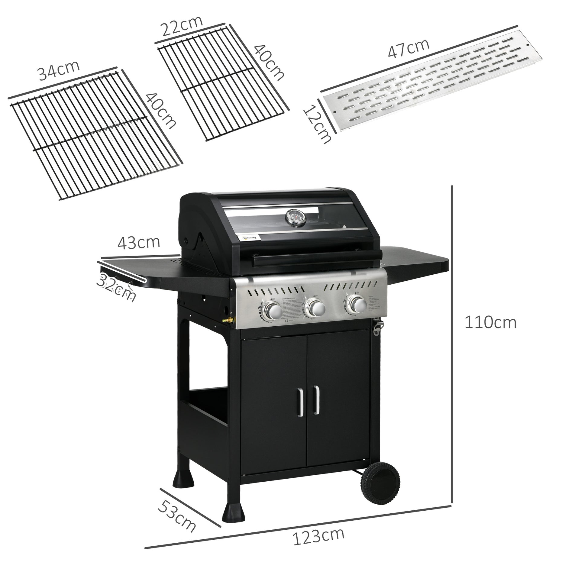 Outsunny 9kW Three-Burner Gas BBQ Grill, with See-Through Lid - Black