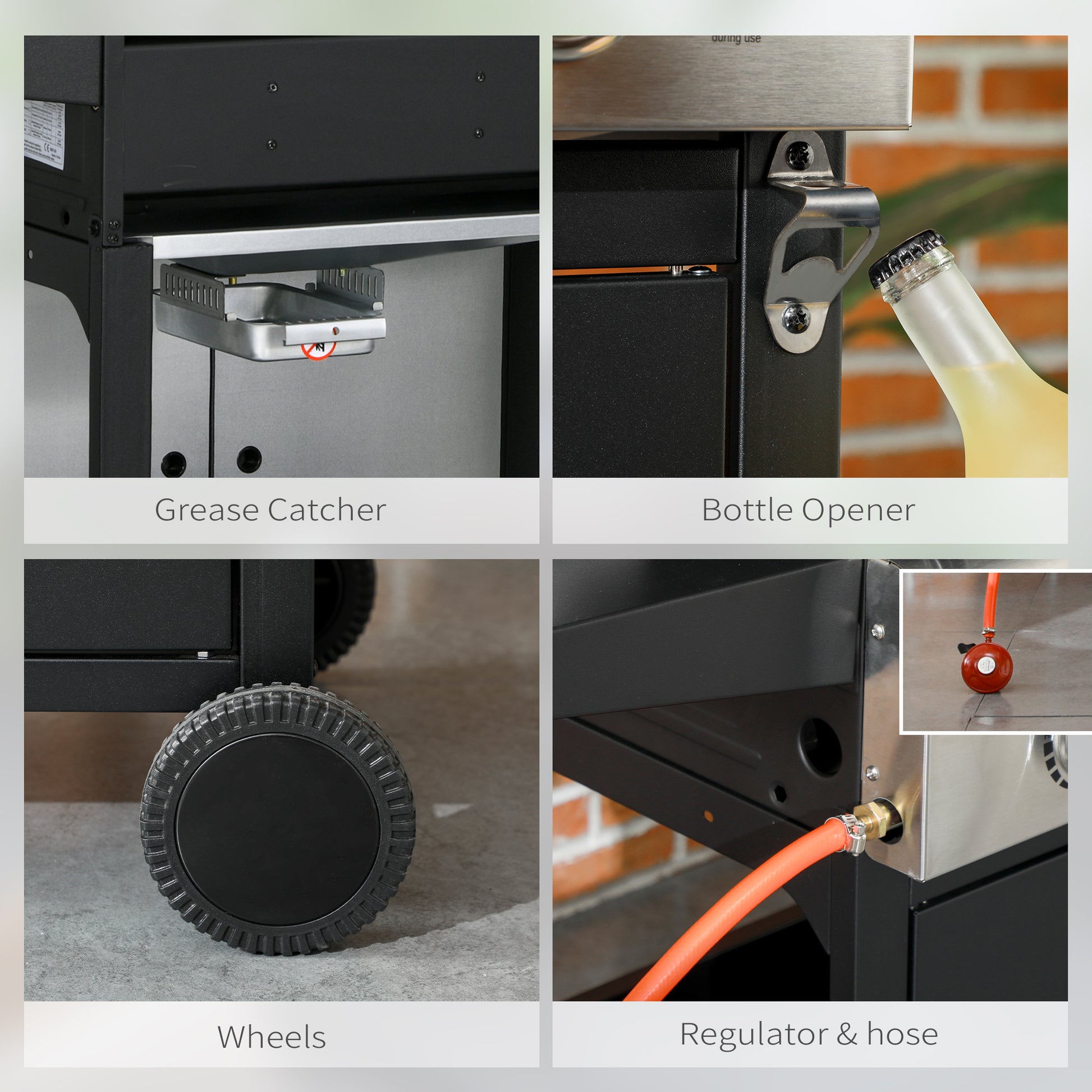 Fire up your outdoor feasts with this Outsunny three-burner gas bbq. The 2408 cm² grilling area is spacious enough for cooking for roughly 5-10 people, with a warming rack to keep food warm when cooked. With a see-through panel on the lid to see inside easily, completed with a thermometer to keep the inner temperature in check.