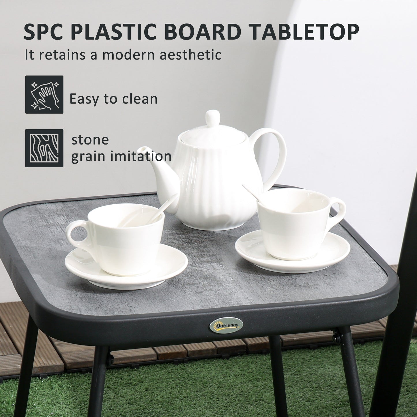 This Outsunny three-piece set is great for relaxing with company outdoors. Comes with two chairs and table. Each piece has a steel frame: strong and supportive. A great addition for all outdoor spaces.