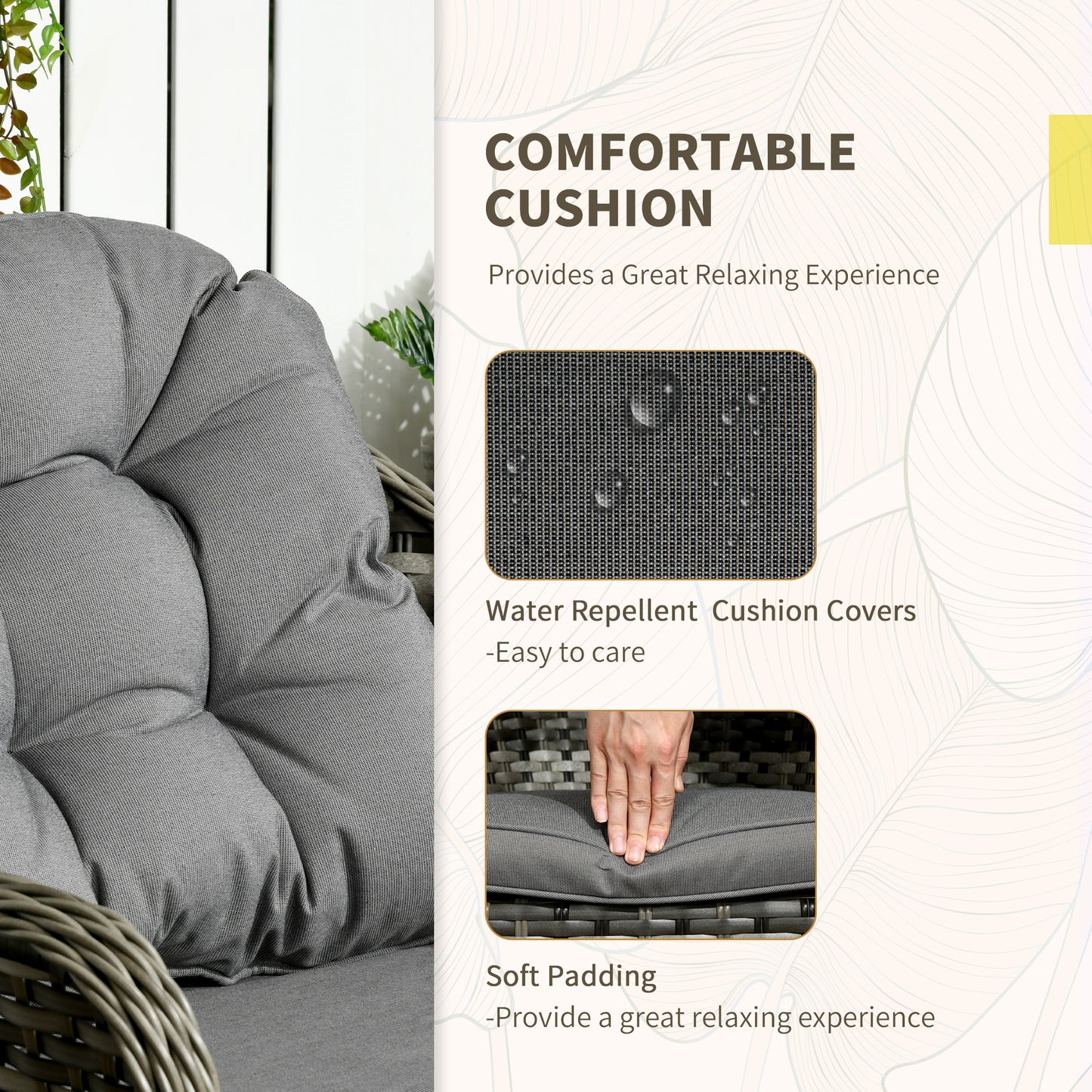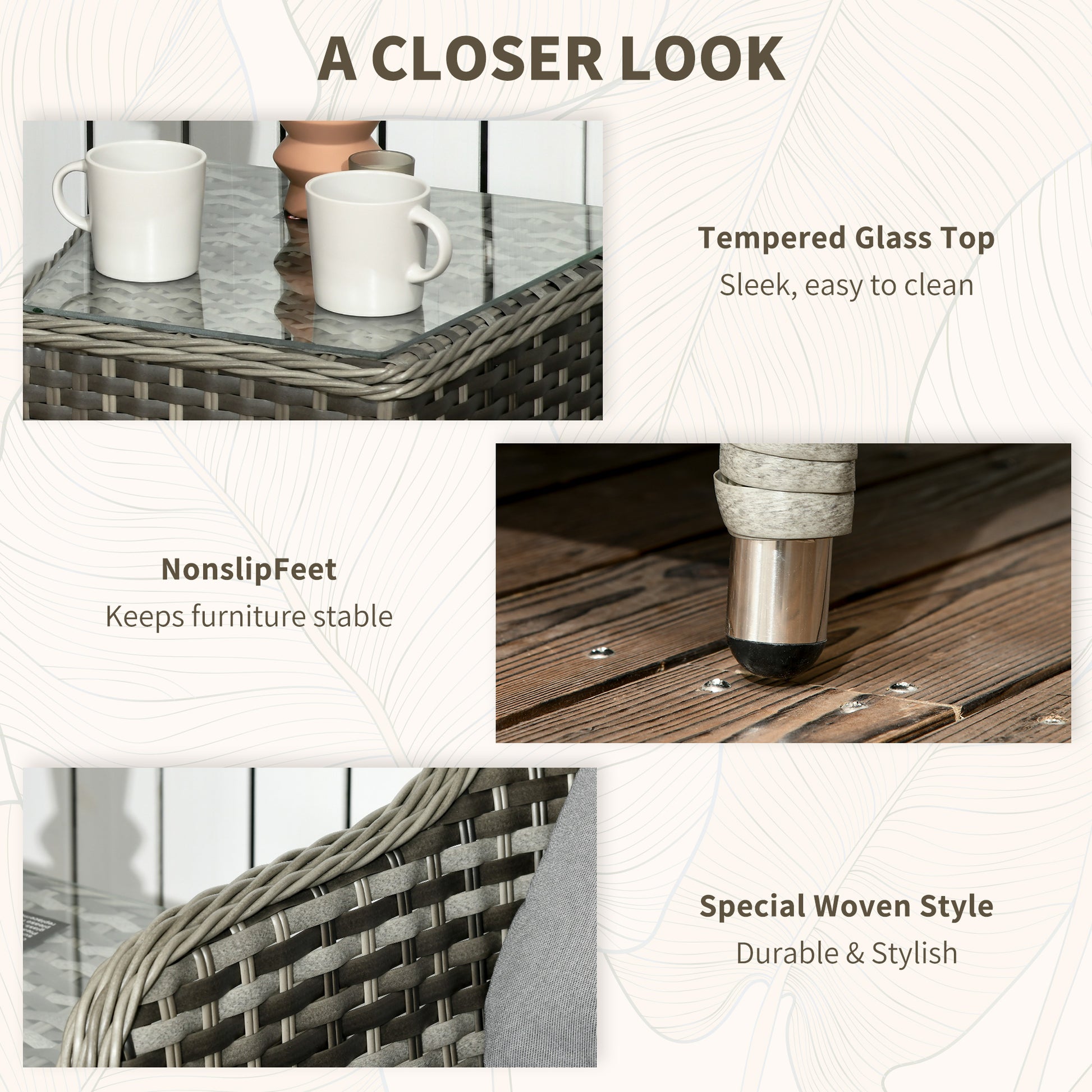 Outsunny 3 Pieces Rattan Bistro Set, Wicker Garden Bistro Set, Glass Top Balcony Table and Chairs with Cushions for Outdoor, Patio, Balcony, Grey