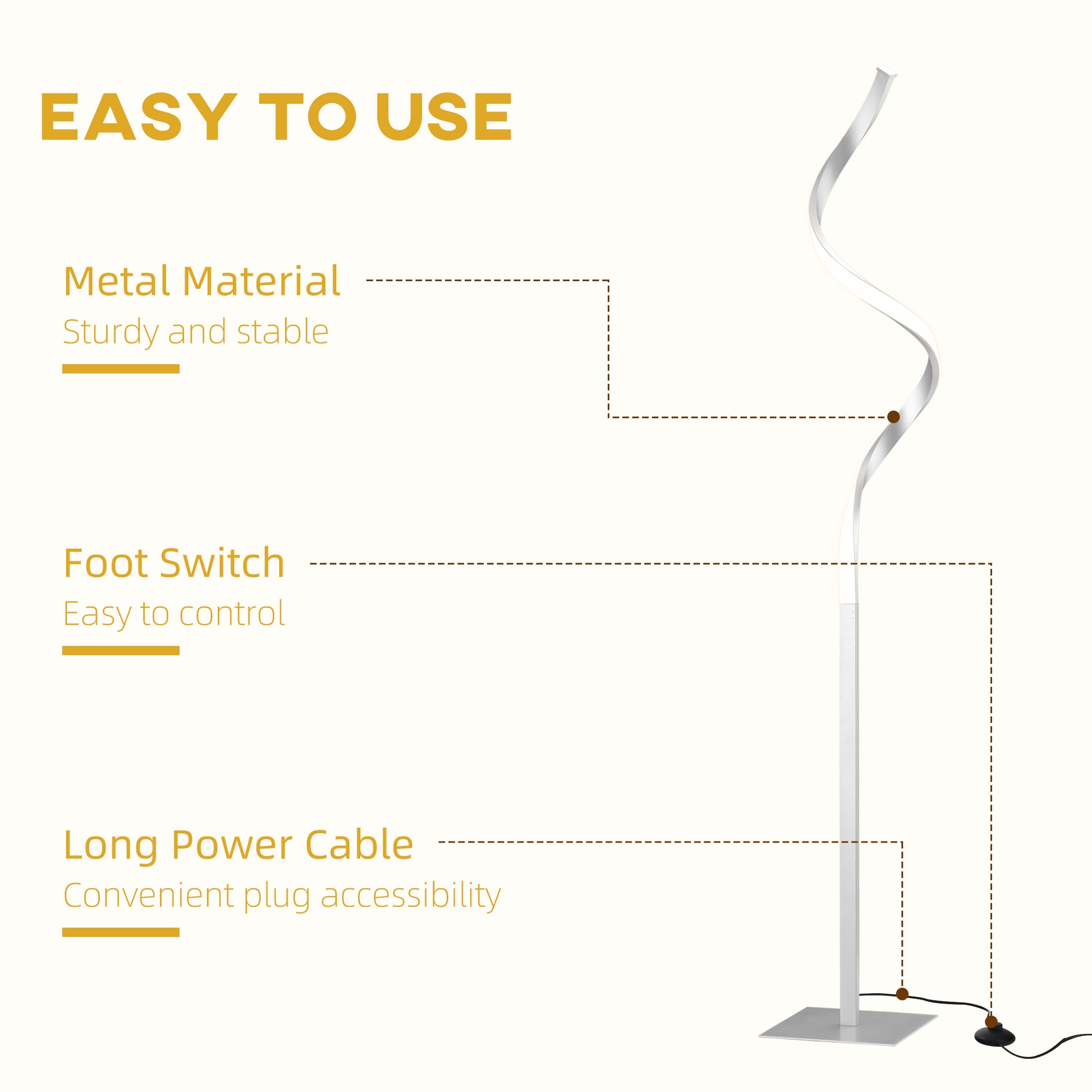 Good lighting is key for creating the right mood in your home. This HOMCOM living room lamp will do just that. A cool, spiral design brings a futuristic feel into your home, whilst the three different colour temperatures allow you to create the vibe you want, whenever. A metal structure for strength, with a square base to stand balanced. Turn on and enjoy the ambience.