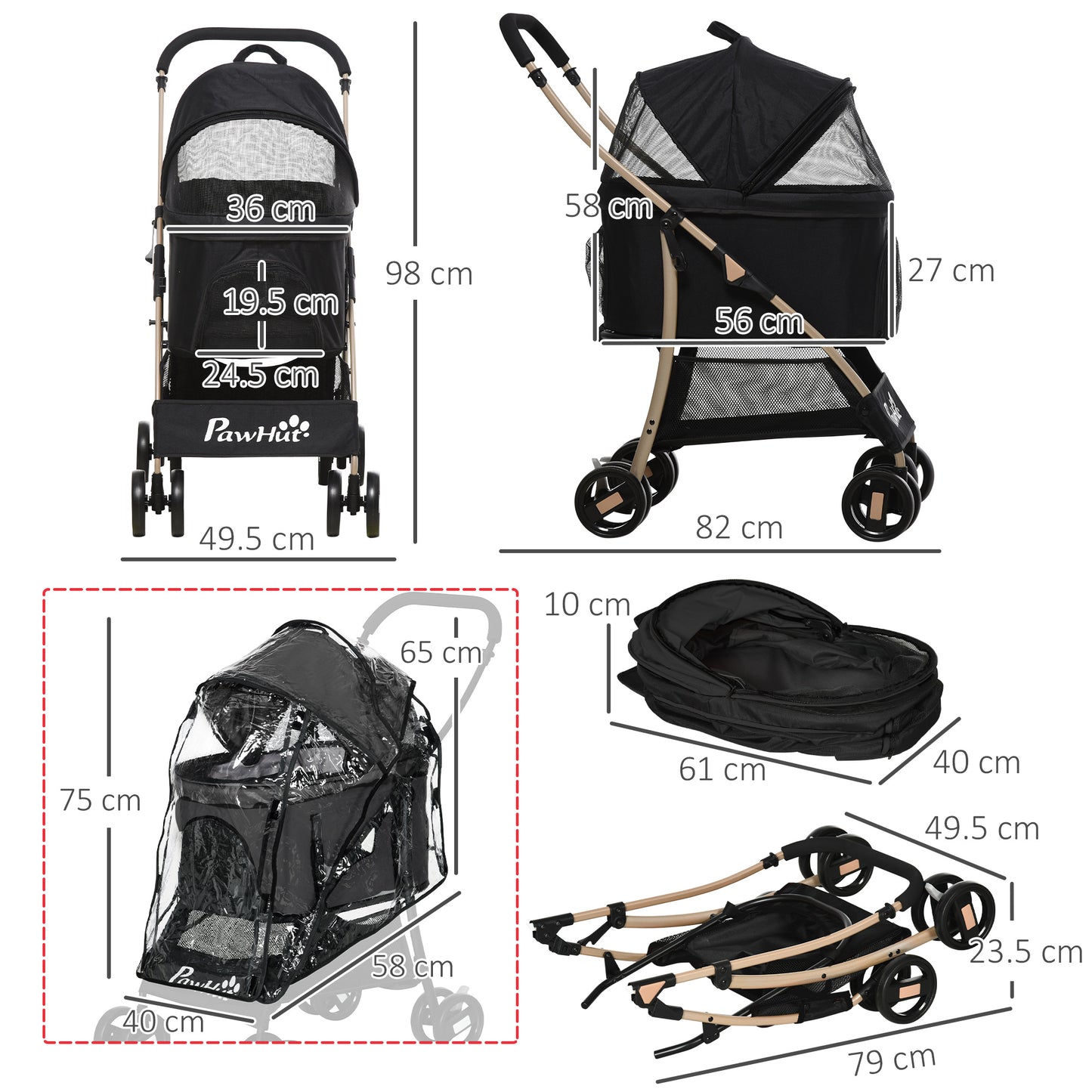 PawHut Detachable Pet Stroller with Rain Cover, 3 In 1 Cat Dog Pushchair, Foldable Carrying Bag w/ Universal Wheels, Brake, Canopy, Basket, Storage Bag for Small and Tiny Dogs - Black